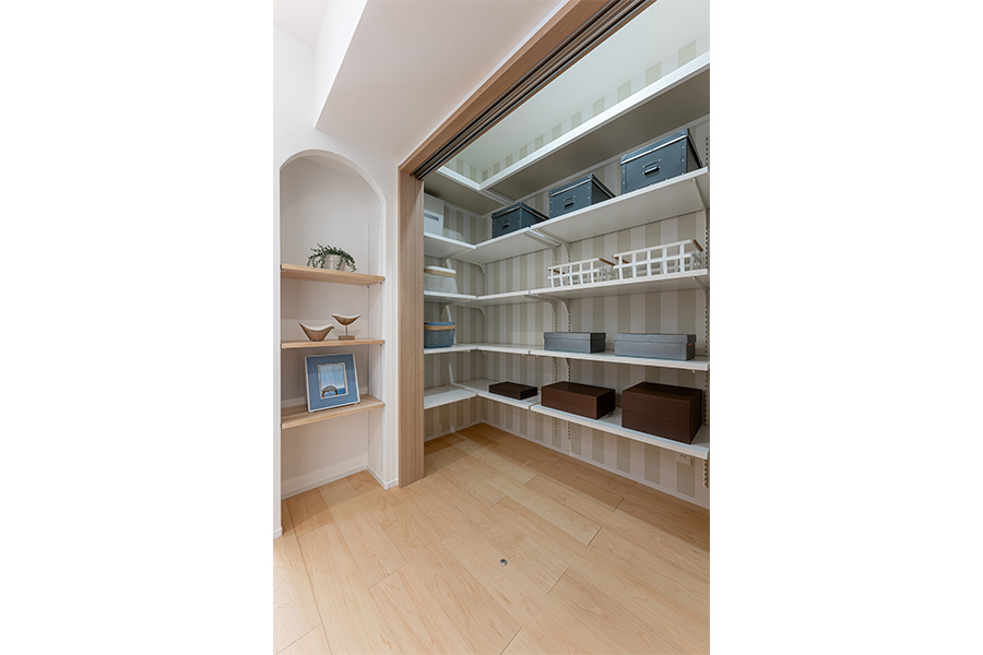 たとえば、廊下の角やキッチン横の壁、階段下など、狭くて既製品の収納家具は置けないけれど、造作ならフィットする場所です。