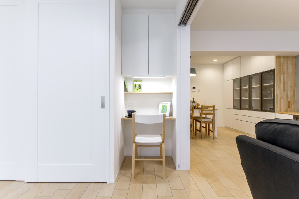 まずは家の中をぐるりと見渡して、「ここならちょっとした机や棚を置けそう」と感じる場所を探してみましょう。窓際やクローゼット横などの寝室の一角は、家族の目線が届きにくく、集中しやすいので特におすすめです。