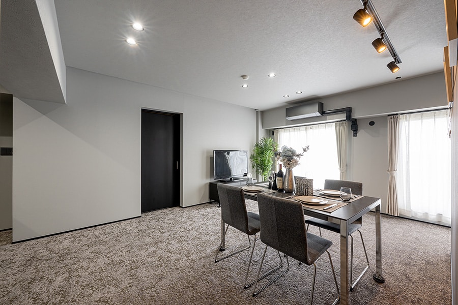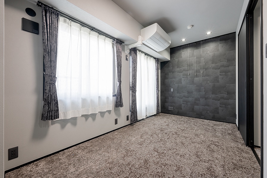 ダークグレーのカーペットにブラックオークの建具、間接照明を組み合わせることで、高級ホテルの一室のようなシックで洗練された雰囲気を演出しました。