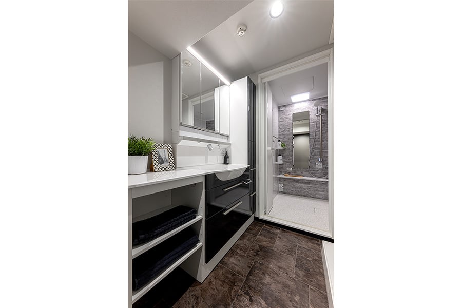 大理石の床とブラックの洗面台で、洗練されたホテルライクな空間に。