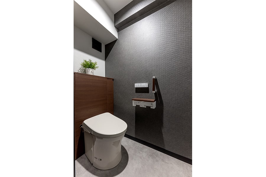 ブラックを基調に、間接照明が柔らかく照らすホテルライクなトイレ。