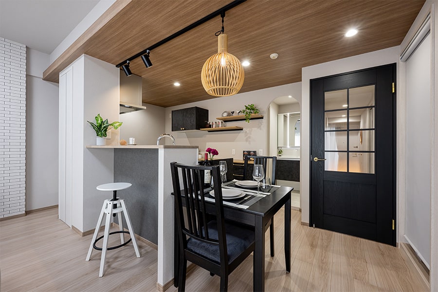 黒を基調とした扉やキッチンに木のぬくもりを合わせ、落ち着きと上質感を両立しました。