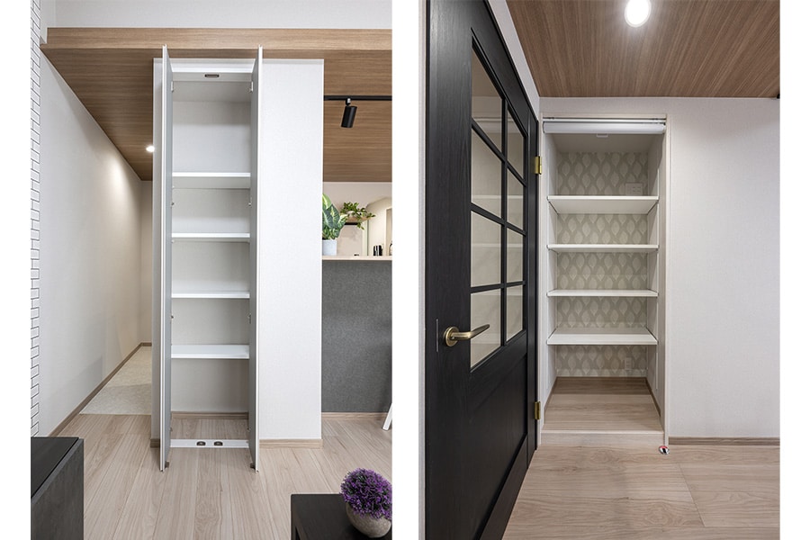 廊下向かいのパントリーで収納も充実。