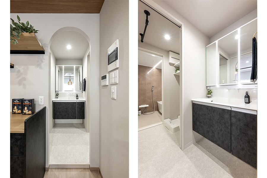 洗面所は独立型にして、居室から見えても美しく映えるよう入口をアーチ壁でデザイン。