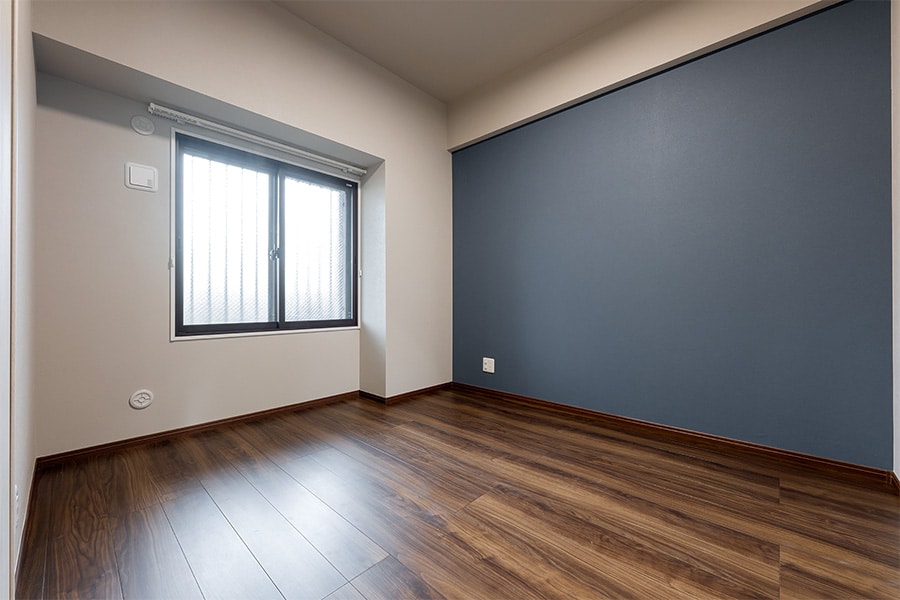 床のウォールナット柄に合わせて、ネイビーのアクセントクロスを採用。