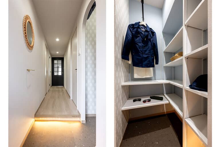 玄関の壁をずらして新設した土間収納や、光を取り込む小窓、ウォークスルークローゼット、DENなど、限られた空間を最大限に生かす工夫も随所に。