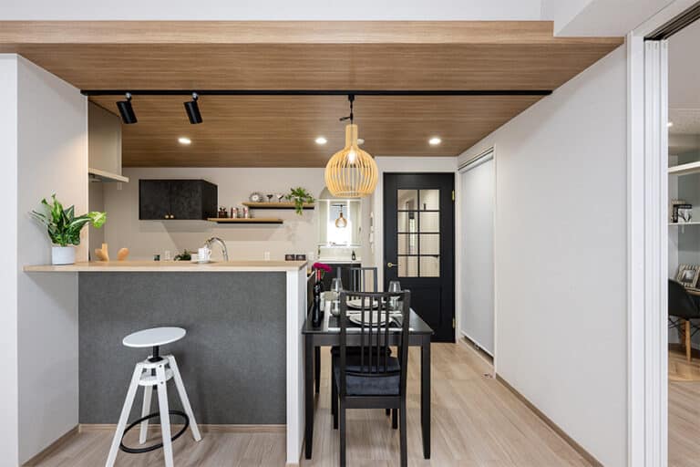 木目の天井と黒のアクセントが、空間に上質な奥行きをプラス。