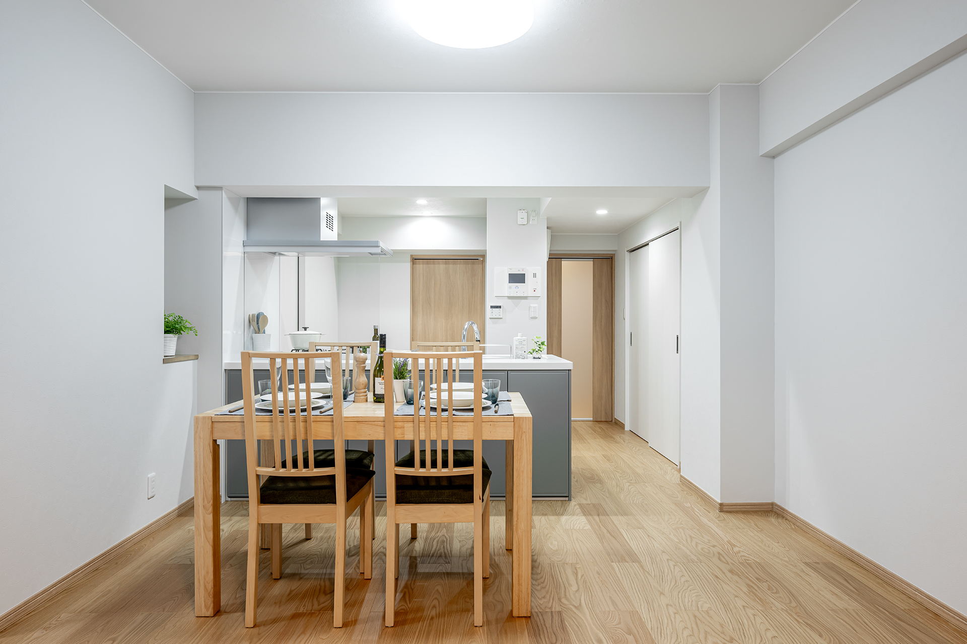 オーク柄を使用した建具&床に壁の白色を合わせ、やさしく明るいLDKに。