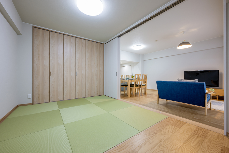 半畳ヘリ無し畳はフローリングとの相性抜群。旅館のようにくつろげる空間です。