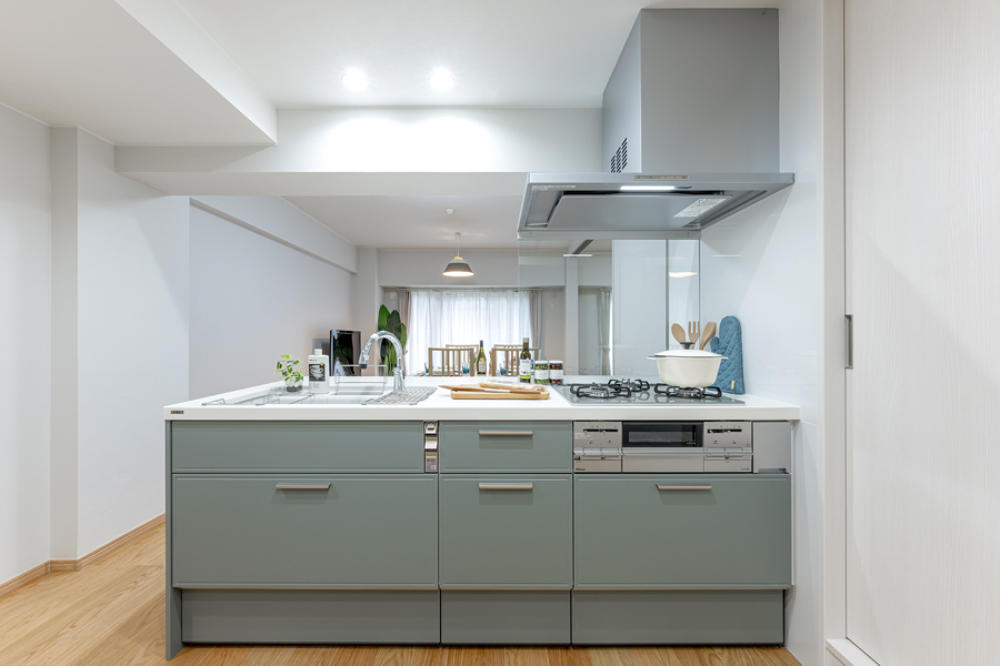 キッチンはインテリアの差し色になる「オリーブグリーン」。