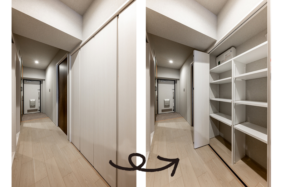 引き戸でスッキリ見せた、廊下に溶け込む大容量収納。